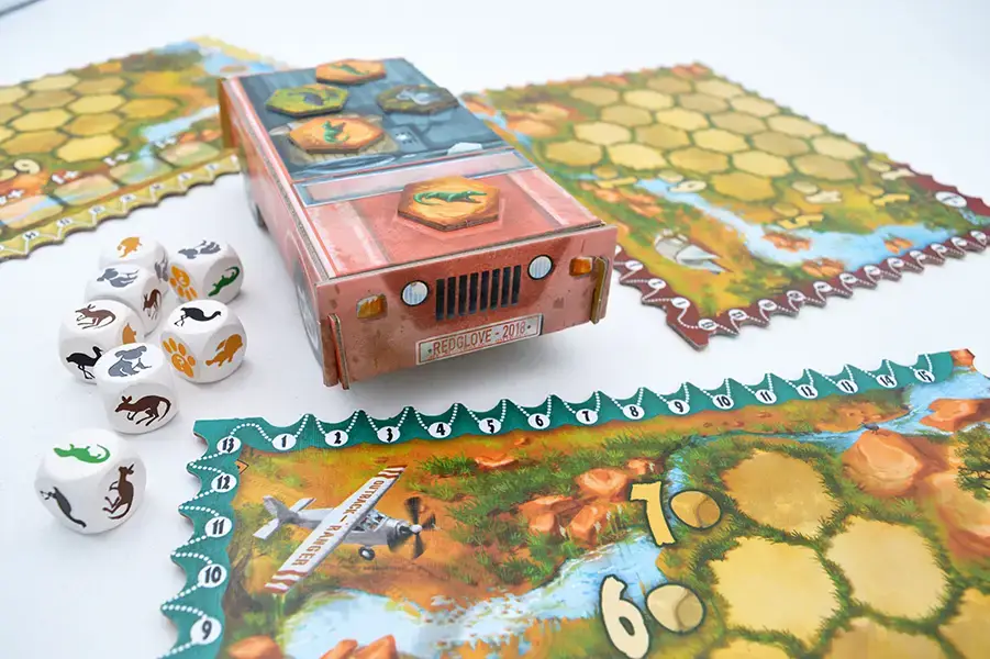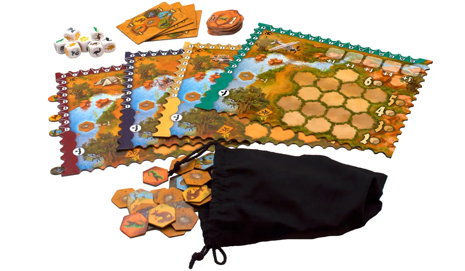 Un gioco di dadi nel quale dovrai fare scelte accurate per riuscire a far crescere i gruppi di animali nella tua plancia. Dovrai cercare di ottenere i risultati migliori posizionando gli animali disponibili sulla jeep negli esagoni della plancia: gli esagoni più alti saranno più difficili da riempire. Se non riuscirai a mettere un’animale, riceverai una tessera desertica che varrà meno punti all’inizio della partita. Saper gestire i propri dadi sarà essenziale per ottenere un ottimo punteggio!