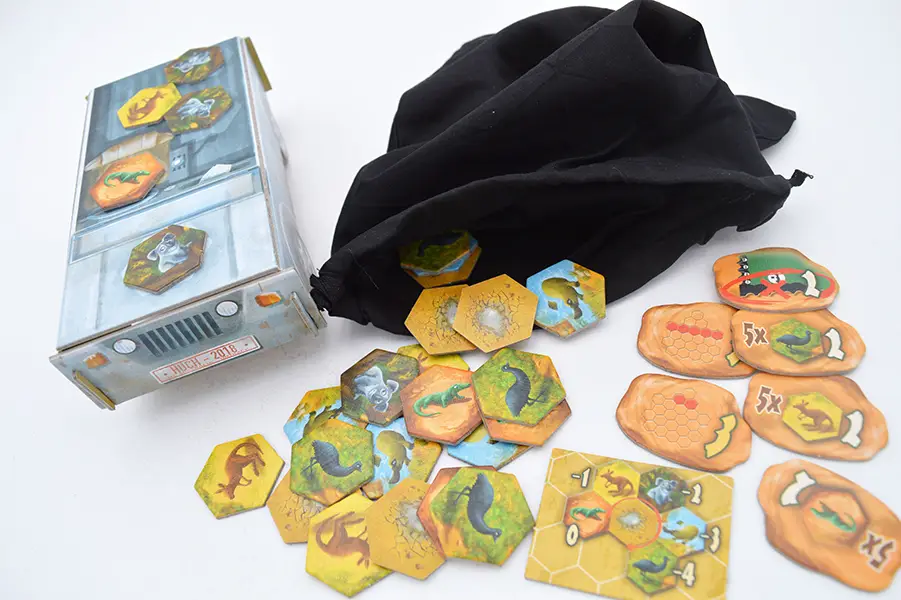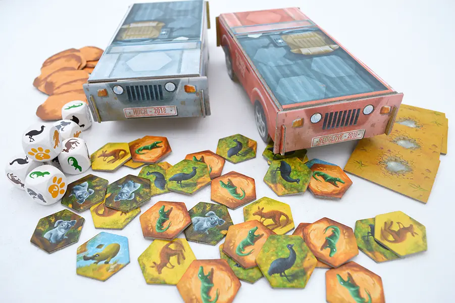 4 Plance Outback 90 Tessere Animali 20 Tessere Bonus 14 Tessere Punteggio Bonus 4 Tessere Punteggi Negativi 7 Dadi 29 Segnalini Punteggio 1 Tessera Primo Giocatore 1 Sacchetto 2 Jeep in Cartone Regolamento.