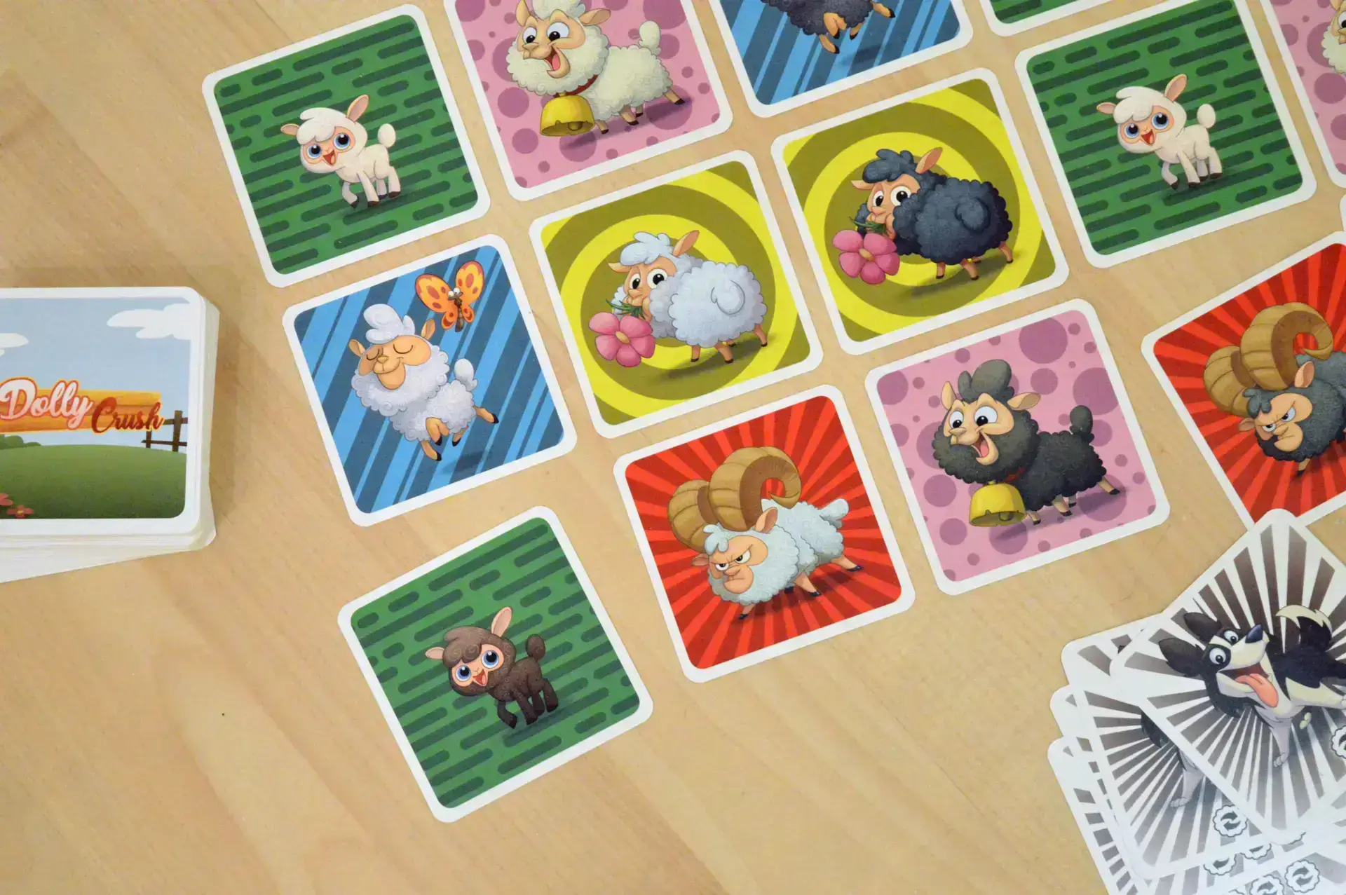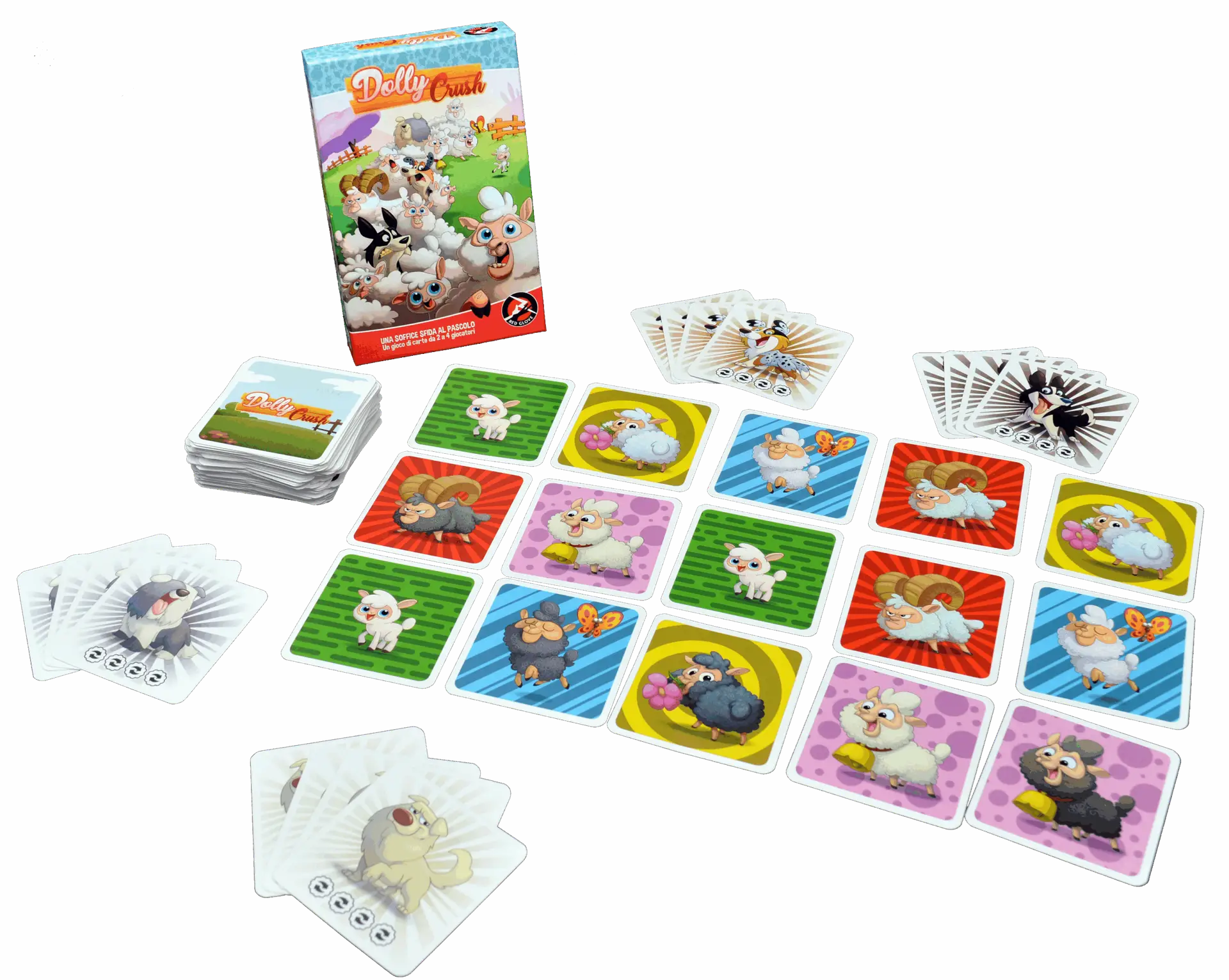 Dolly Crush è un’avvincente e “soffice” sfida al gregge più grande. Scambia le pecore fra loro con l’aiuto dei cani per ottenere file e colonne dello stesso tipo. Arricchisci le combinazioni con le rare pecore nere e crea il gregge più numeroso! Hai a disposizione 4 carte cane che riportano da 1 a 4 movimenti. Ogni turno, puoi giocarne una sola che non avrai più per tutta la partita. Fai i movimenti indicati scambiando le tessere: se ottieni tris o più di carte con pecore uguali le prendi e le metti da parte per punti! Le pecore nere valgono doppio!