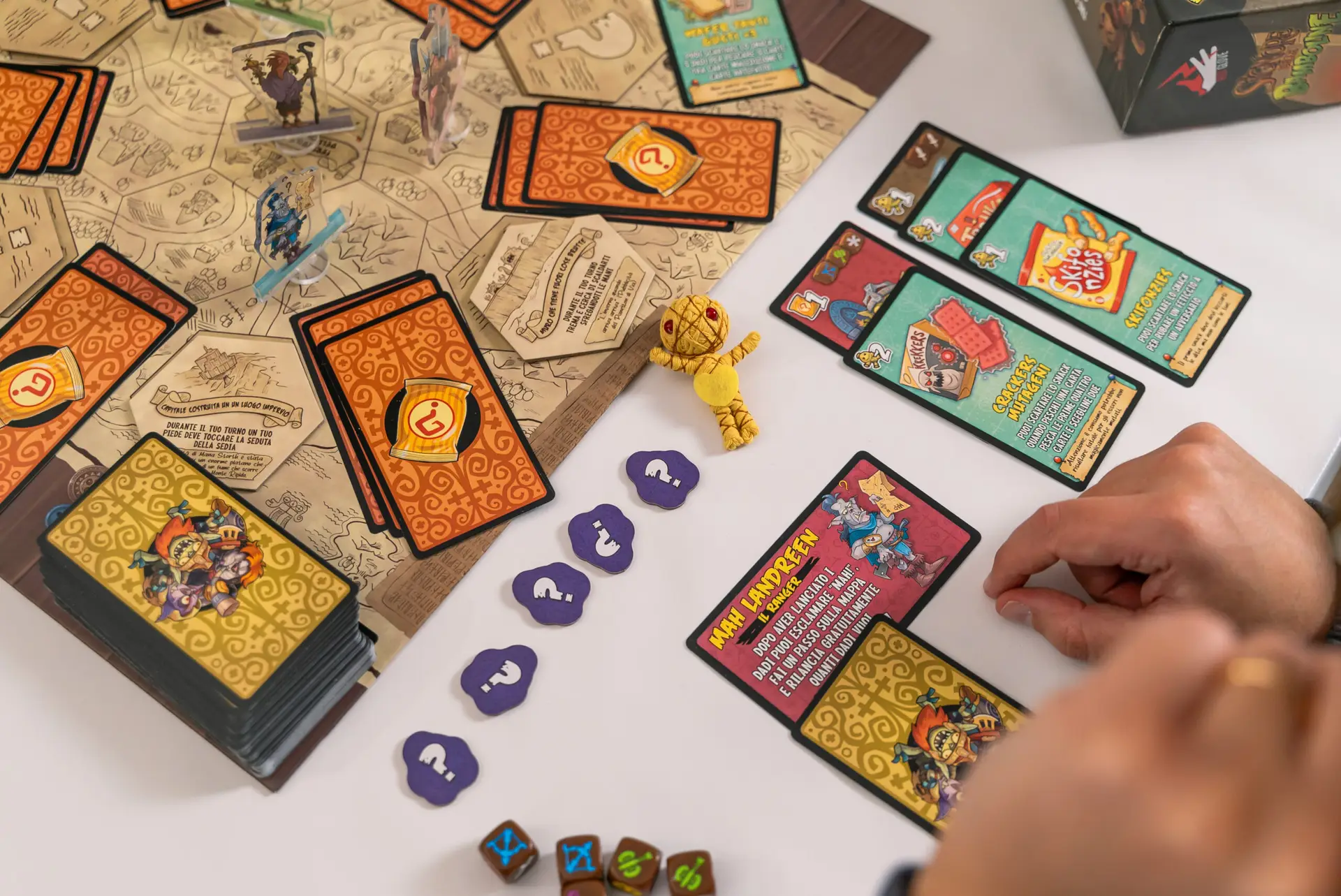 Tre pupazzi al re degli elfi sotto il cielo che riluce, sette bambole ai nanetti che rifuggono al luce… Nella terra di Buione un’ombra nera cala quando “qualcuno” ha fatto finire l’unica bambolina dell’Oscuro in mezzo a centinaia di fettici sorpresa degli irresistibili snack fabbricati nella terra di tre quarti… E ora sono maledizioni! Nella parodia più divertente del mondo fantasy, Vudù: Il Signore delle Bamboline ti invita a calarti nei panni dei servitori dell’Oscuro, dovrai lanciare maledizioni epiche ai tuoi avversari, esplorare luoghi misteriosi e ingurgitare snack improbabili alla ricerca dell’Unica Bambolina Vudù. Il tuo obiettivo? Recuperarla e piegare i tuoi rivali con maledizioni esilaranti e artefatti assurdi. Ma attento: ogni tua mossa può peggiorare tutto… in modo spettacolare!