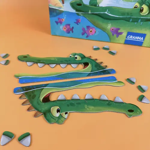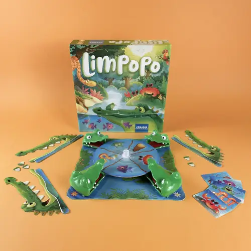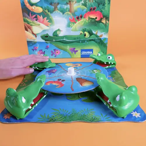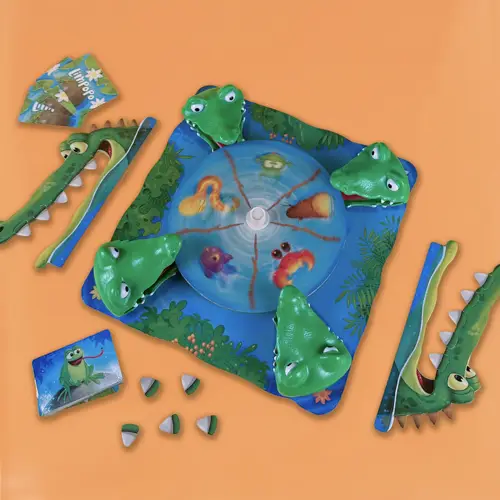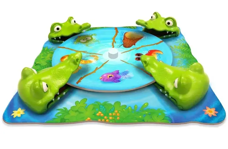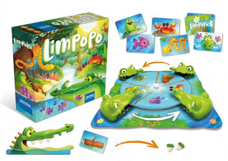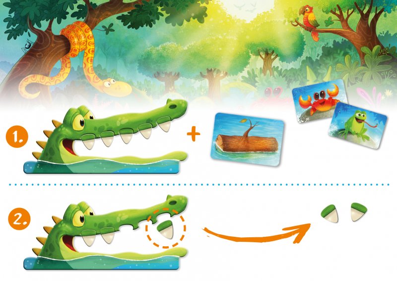 1 Plancia fiume con vortice d’acqua 4 coccodrilli in plastica 4 plance coccodrillo 24 denti 40 carte snack 4 carte tronco 8 carte speciali