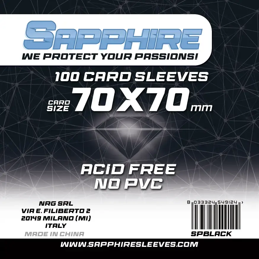 Le Sapphire Sleeves sono spesse 60 micron. Un compromesso perfetto tra le bustine più economiche (40 micron) e quelle più spesse. 60 micron garantisce alta protezione alle vostre carte, una spesa economica e permette ai vostri mazzi di tornare all’interno delle scatole dei giochi, senza che la loro altezza duplichi o triplichi.