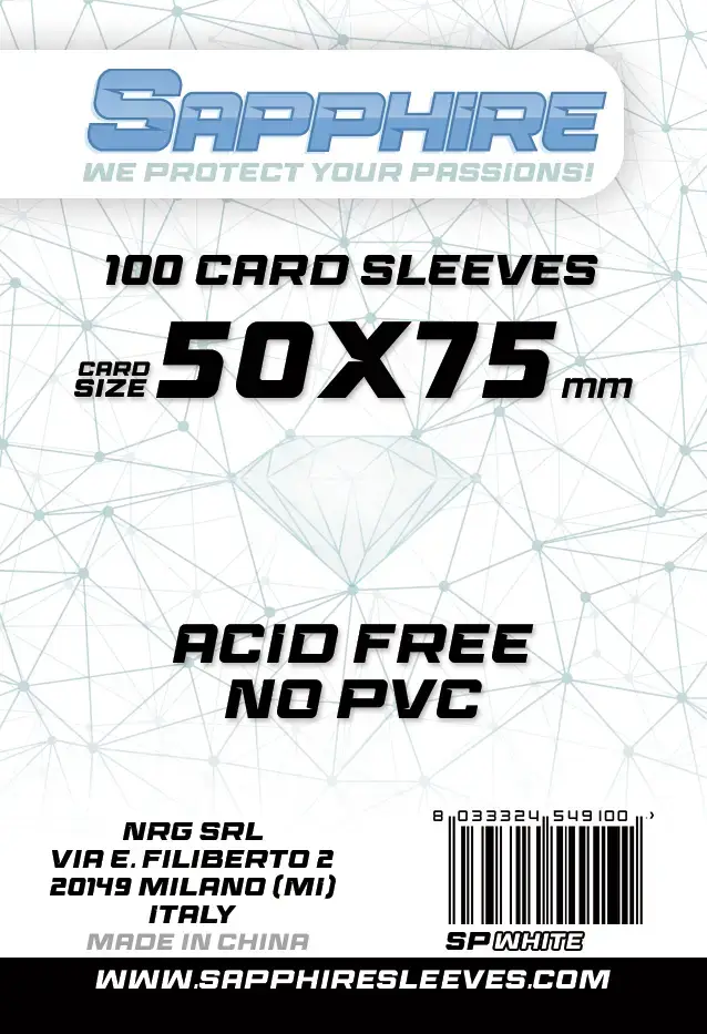 Le Sapphire Sleeves sono spesse 60 micron. Un compromesso perfetto tra le bustine più economiche (40 micron) e quelle più spesse. 60 micron garantisce alta protezione alle vostre carte, una spesa economica e permette ai vostri mazzi di tornare all’interno delle scatole dei giochi, senza che la loro altezza duplichi o triplichi.