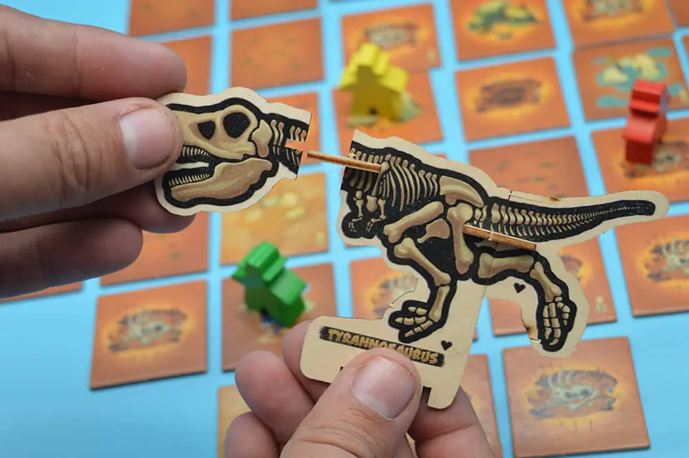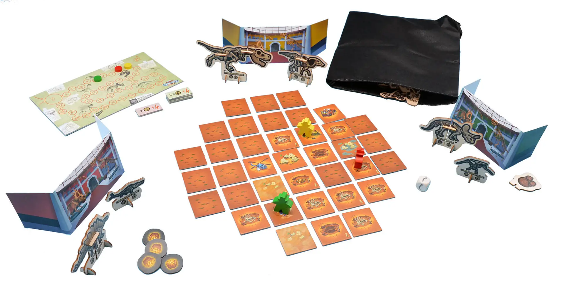 4 Pedine Archeologo, 1 Dado, 56 Tessere, 8 Tessere Obiettivo, 32 Dinosauri (8 Grandi, 12 Medi, 12 Piccoli), 3 Tessere Oro, 6 Segnalini Attivazione, 4 Pedine Punteggio, Segnapunti, Regolamento